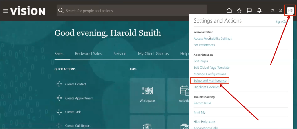 Login to the Fusion Instance and Click on Setup and Maintenance under the Username.