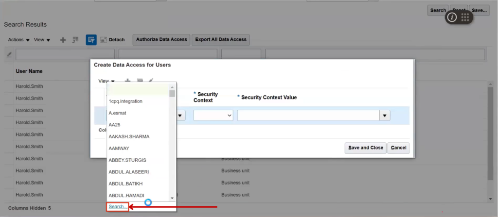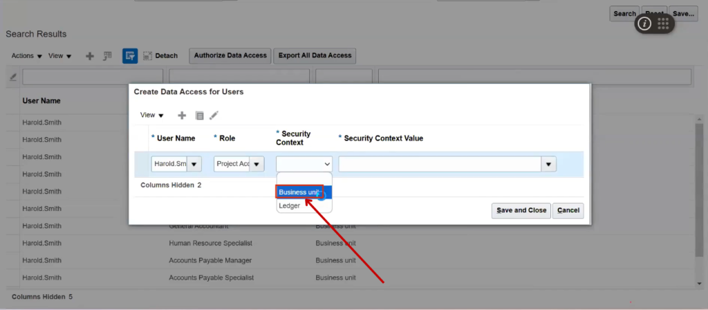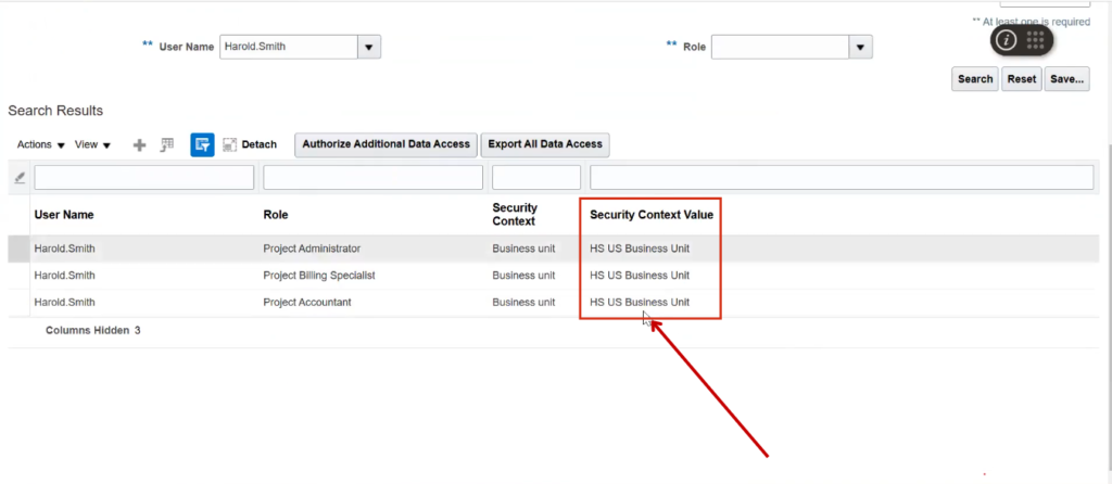 Select Business Unit from the Security Value dropdown and choose HS US Business Unit for the Security Context value.