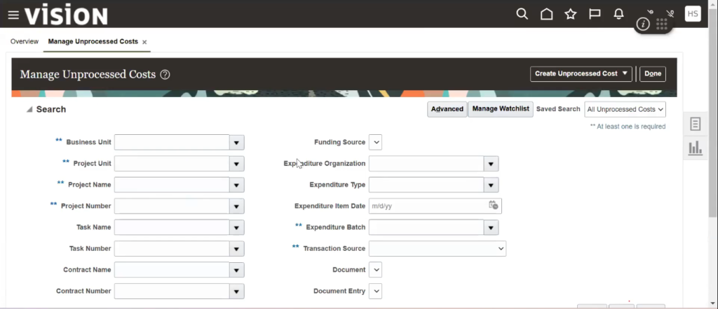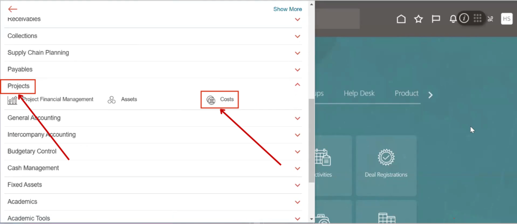 Expand the Projects section and click on Cost from the navigation menu to check whether the business unit is appearing or not.